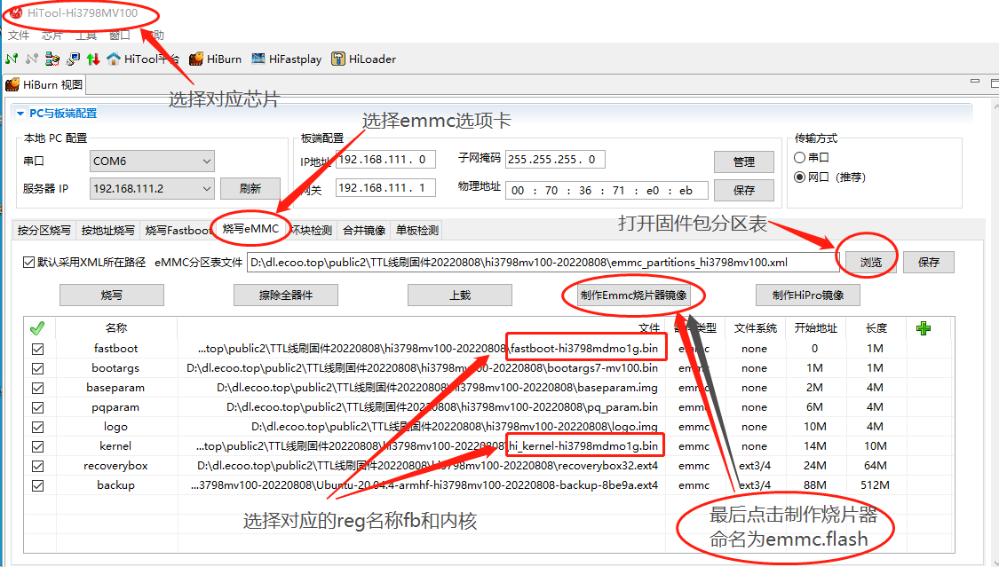 2.打开海兔工具,选择芯片,选择烧写 emmc 选项卡,浏览打开解压包里的 XML 分区表文件;