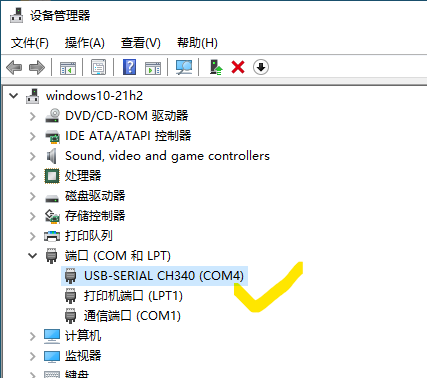 记住这个COM口的数字,比如这里的COM4.CH340转接模块多数是免驱的,CP2102,3202等,多数是需要安装驱动的。